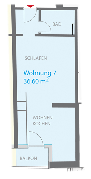 36,5 m2 · Wohnschlafzimmer · Küche · Bad · Vorraum · Loggia mit Blick auf See und Gebirge · Badekabine am See