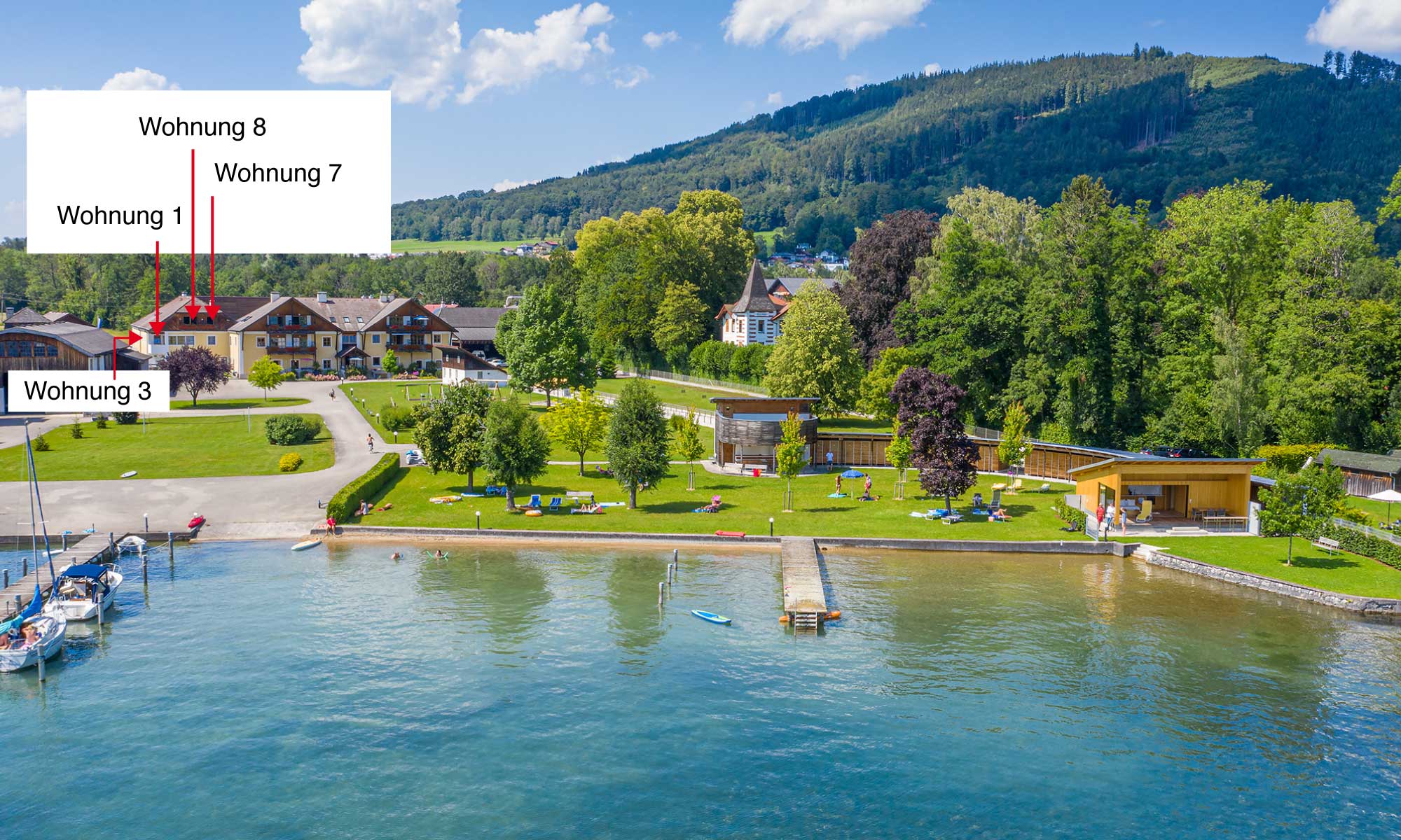 · Jede Wohnung mit eigener Badekabine samt Liegen am See
