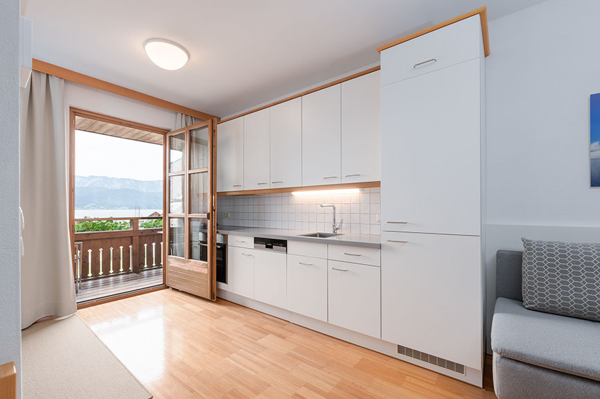 36,5 m2 · Wohnschlafzimmer · Küche · Bad · Vorraum · Loggia mit Blick auf See und Gebirge · Badekabine am See